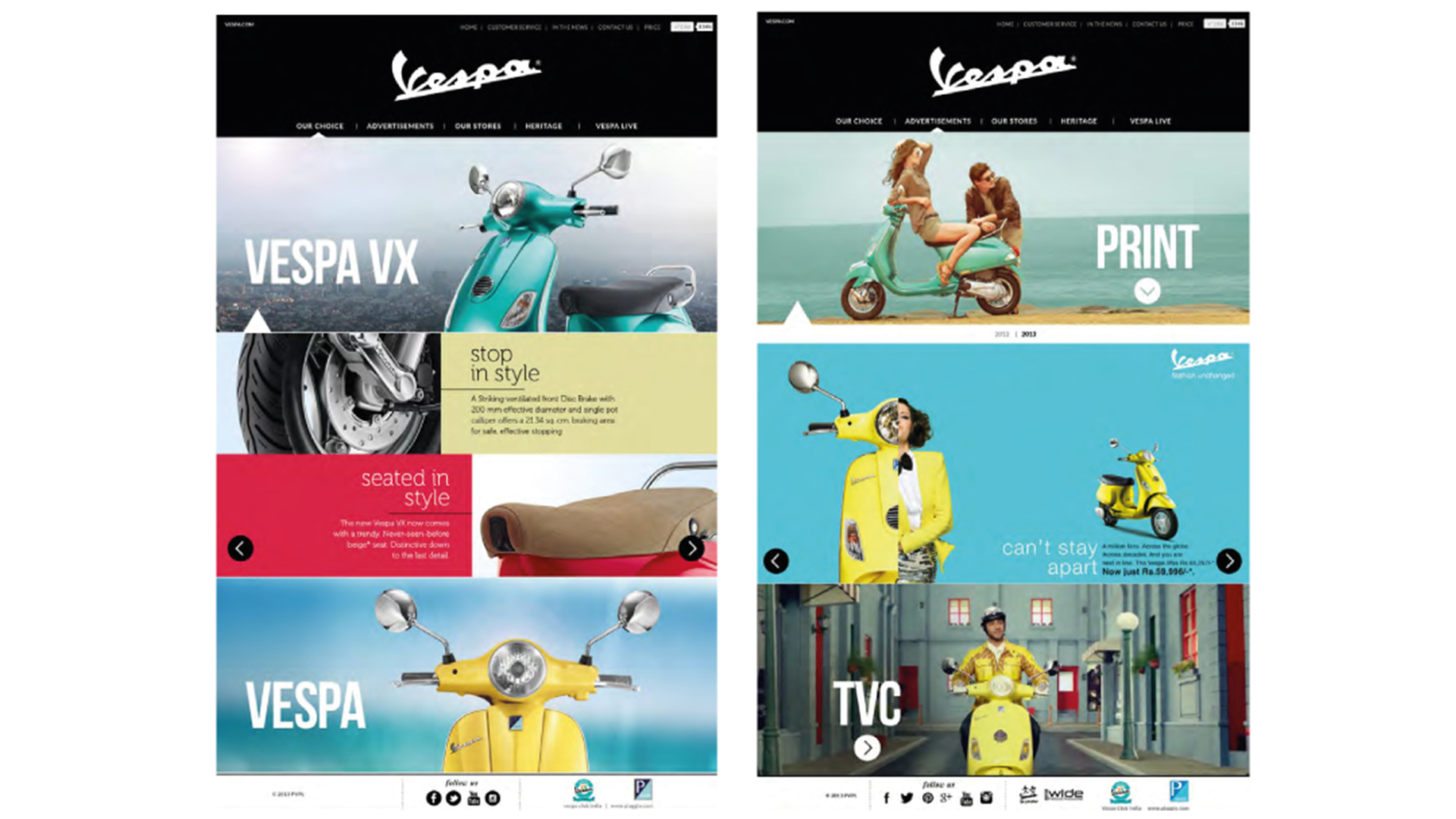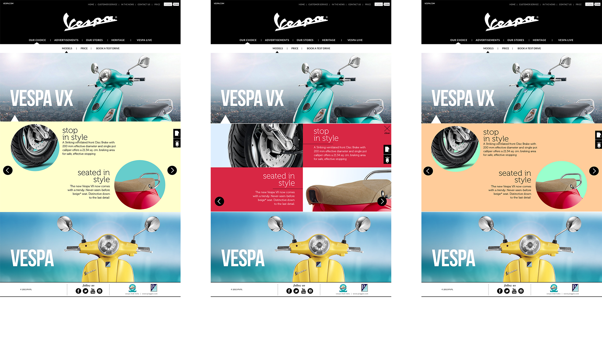 During my time at Ogilvy & Mather, I was part of the core design team behind a major Vespa campaign. I helped translate the brand’s playful, aspirational positioning into digital experiences—designing web layouts and campaign pages that showcased the Vespa lifestyle through bold photography, vibrant color blocking, and clean modular grids. The work tied together product storytelling and campaign assets to create a cohesive, contemporary look across touchpoints, translating the brand’s iconic lifestyle into a fresh digital experience. I worked on campaign layouts, web pages, and visual adaptations that paired bold color blocking with clean product storytelling—highlighting key features while keeping the spirit of freedom, youth, and Italian style at the center of the design.
