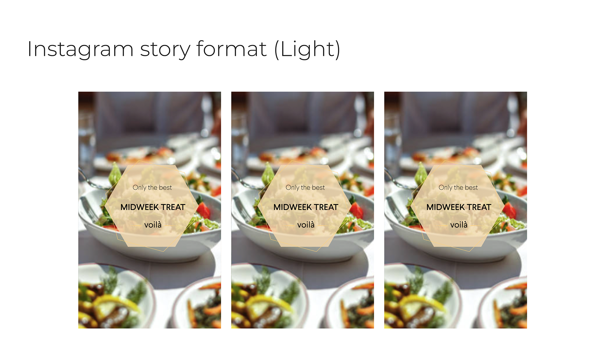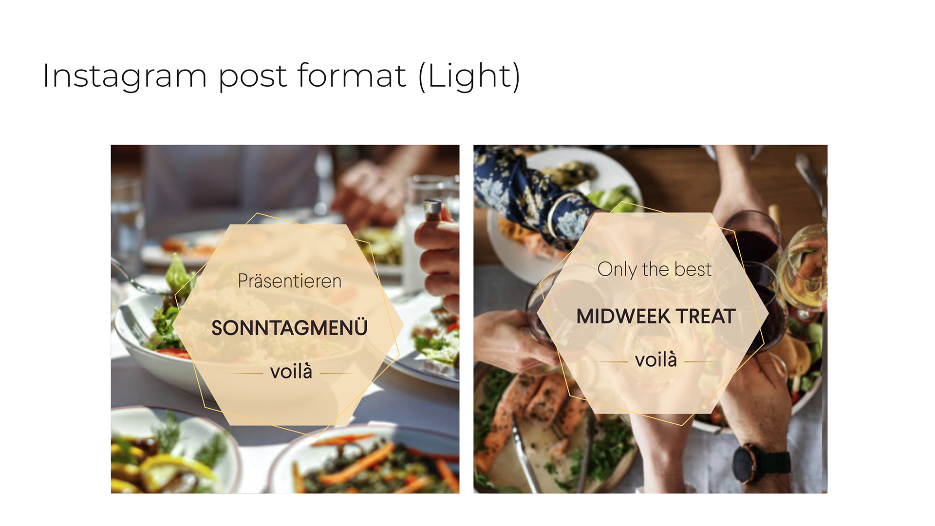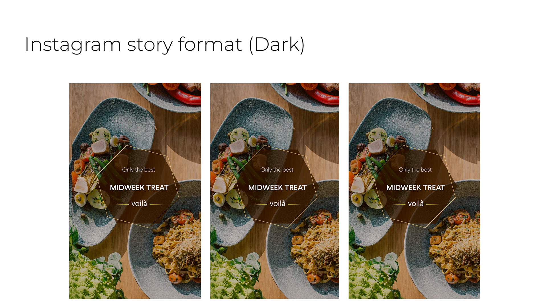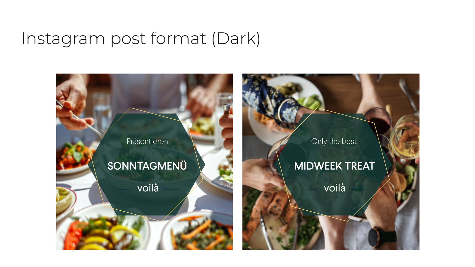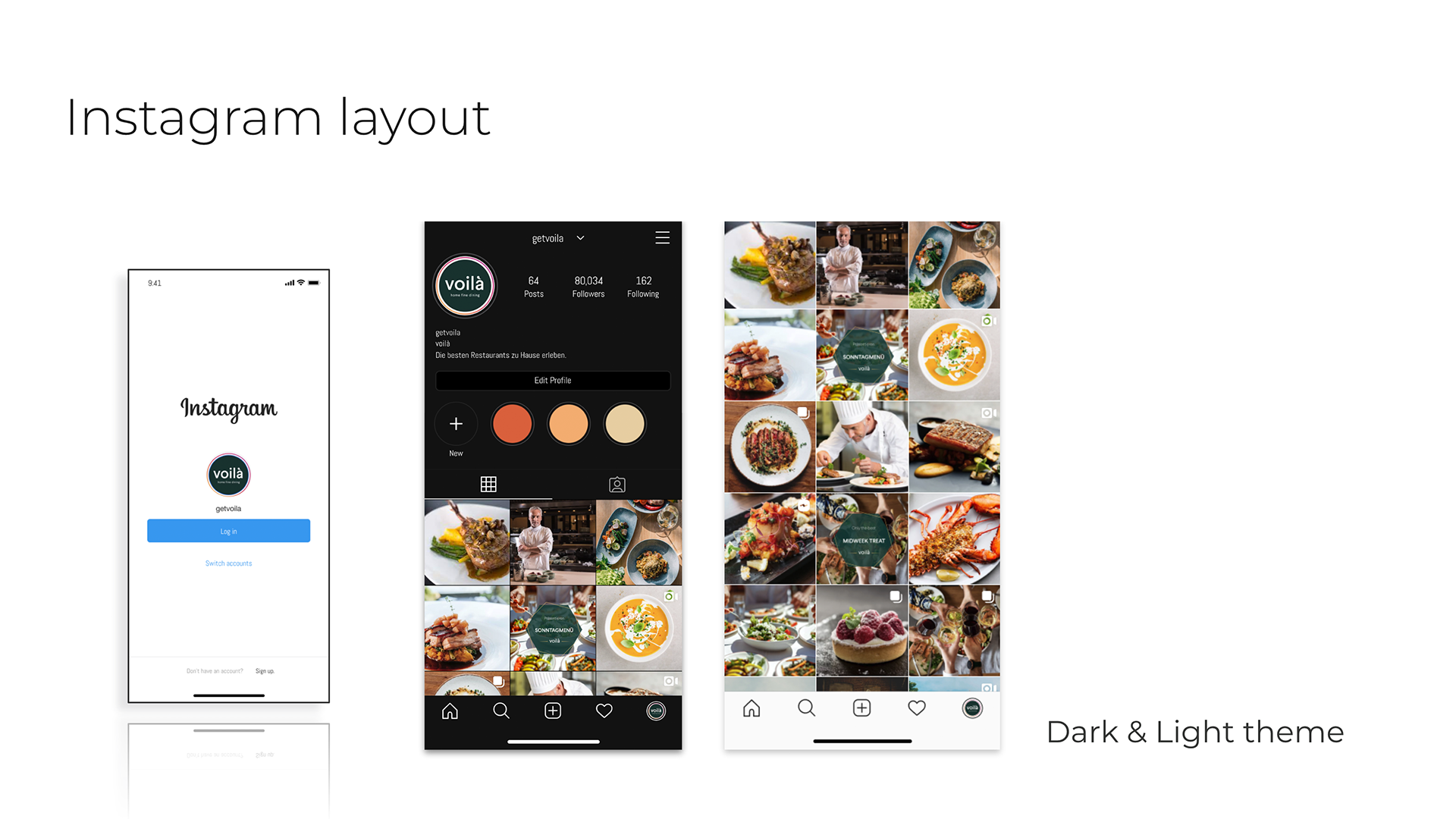 For Berlin-based food & beverage company voilà, The proposal defines a clear brand personality—unique, personalised, fresh—and translates it into warm, appetising colour palettes, geometric overlays, and modular layouts. I created a full set of Instagram post and story templates in both light and dark themes, along with a cohesive grid concept for the feed, giving the brand a flexible social toolkit that highlights real food photography while keeping the identity instantly recognisable. It includes a flexible visual system for social media, with light and dark Instagram themes, story and post templates, and review formats that hero appetising photography framed by geometric overlays. Warm, food-forward colour palettes and clean typography tie the identity together, creating a coherent look that scales from digital touchpoints to broader brand communications.